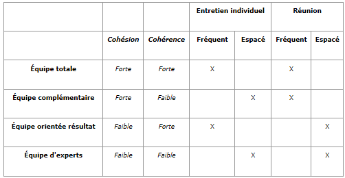 Ainsi, dans une équipe où le besoin de cohérence est dominant, l'entretien individuel sera privilégié ; dans une équipe où il est faible, la réunion trouvera plus sa place.