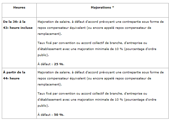 Quelle que soit la taille de votre entreprise, le taux de majoration des heures supplémentaires est le suivant :