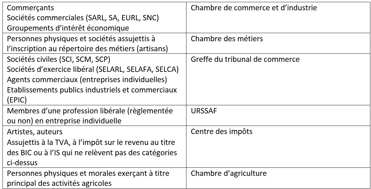 Vous devez vous adresser au CFE (centre de formalités des entreprises) dont vous dépendez de votre entreprise. Celui-ci est fonction du type d’entreprise que vous créez :